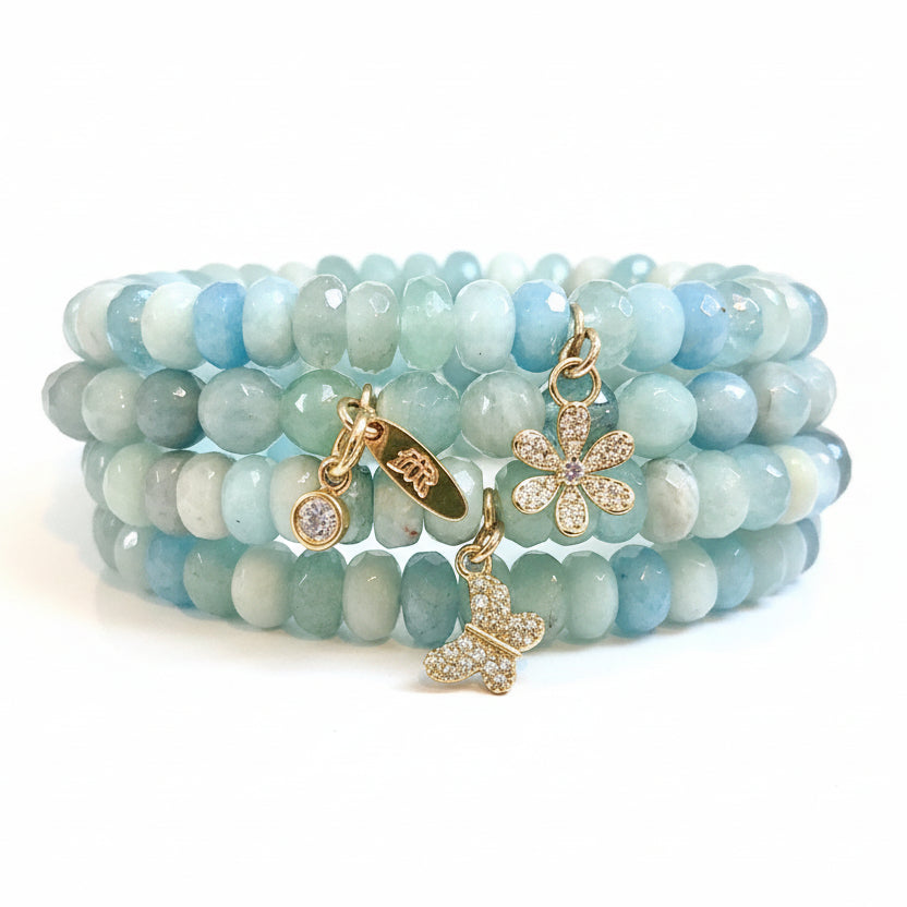 The Puna (“spring” in Hawaiian) stack set is a set of three bracelets made of genuine stunning aquamarine beads with gold pavè accents and the sweetest flower, butterfly and sparkle charms. A little bir of springtime happiness on your wrist!