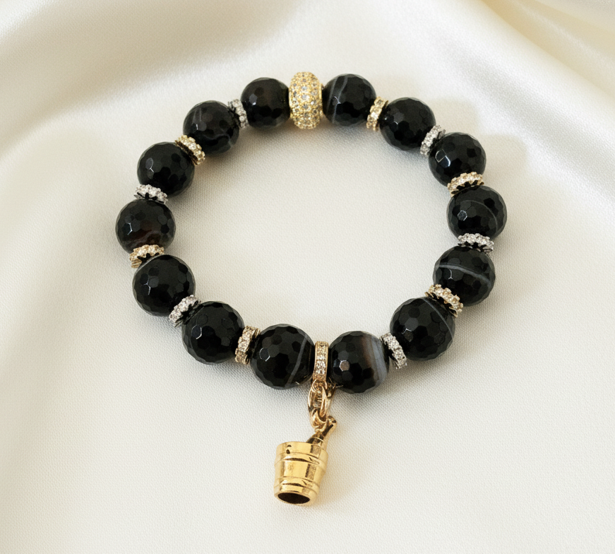 The Bubbly bracelet is the perfect party accessory. Stunning genuine sardonyx beads with gold and silver pavé accents and a 14K champagne bottle with bucket charm. Wear it to your next celebration!